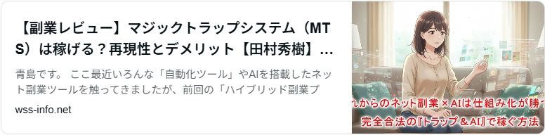 もっと詳しいレビュー記事と特典の内容が知りたい方は、以下のリンクで田村秀樹氏のマジックトラップシステムMTSをレビューしていますので、ぜひ読んでみてください(^^)